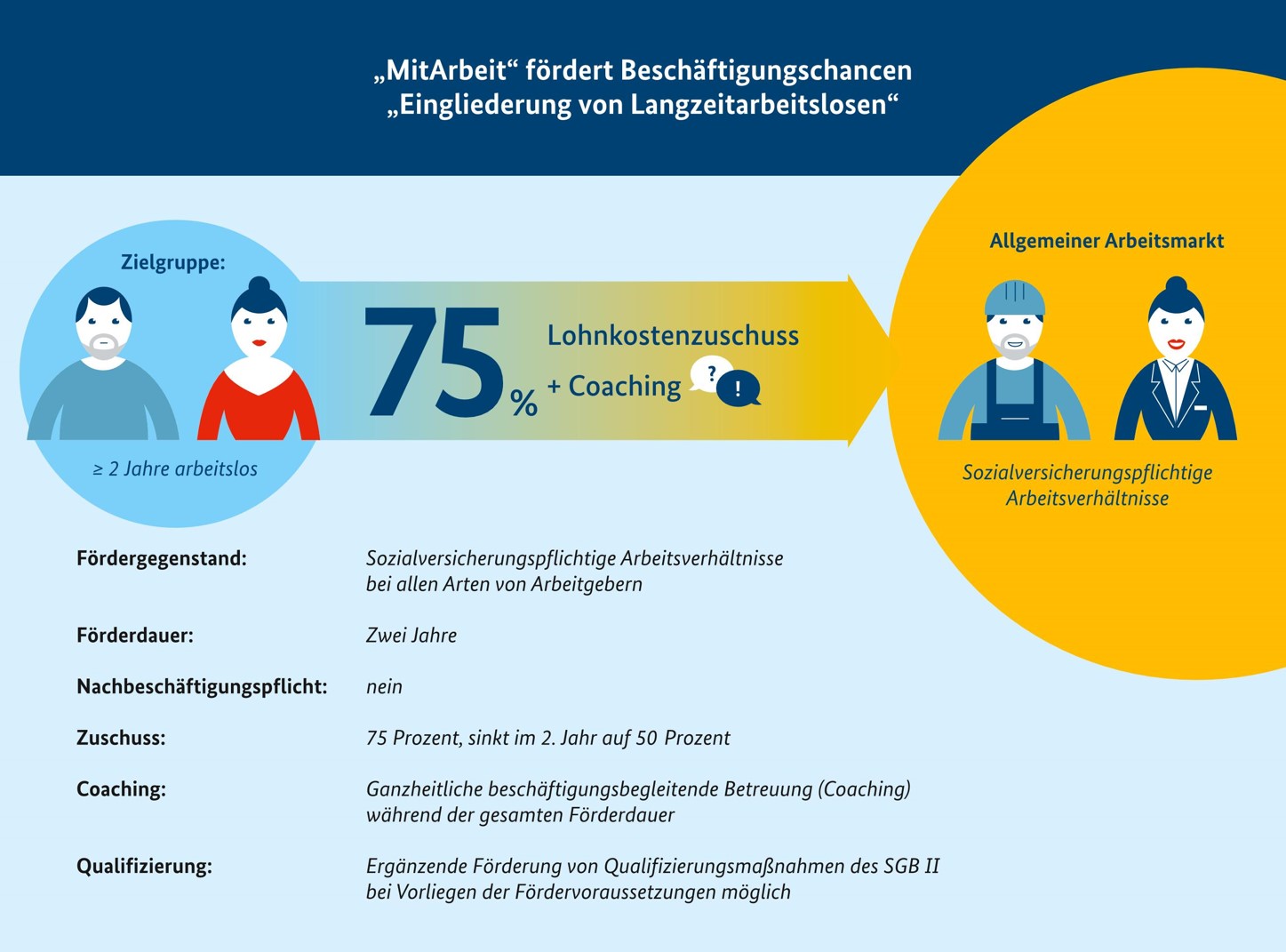 Durch Förderung eines zweijährigen Beschäftigungsverhältnisses soll erwerbsfähigen Leistungsberechtigen, die seit mindestens zwei Jahren arbeitslos sind, der Wiedereinstieg ins Erwerbsleben erleichtert und mittelfristig der dauerhafte Verbleib im ersten Arbeitsmarkt ermöglicht werden.