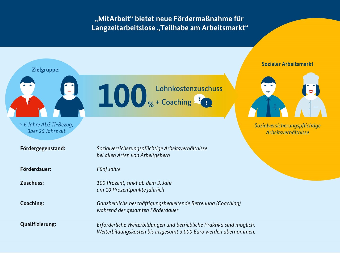 Erwerbsfähige Leistungsberechtigte über 25 Jahre, die seit mindestens sechs Jahren Arbeitslosengeld II beziehen und in dieser Zeit nicht oder nur kurzzeitig beschäftigt waren, sollen durch Förderung eines bis zu fünfjährigen Beschäftigungsverhältnisses wieder an das Erwerbsleben herangeführt werden. Vorrangiges Ziel ist die Eröffnung von Teilhabechancen, langfristig aber auch der Übergang in eine nachhaltige, ungeförderte Beschäftigung am ersten Arbeitsmarkt.